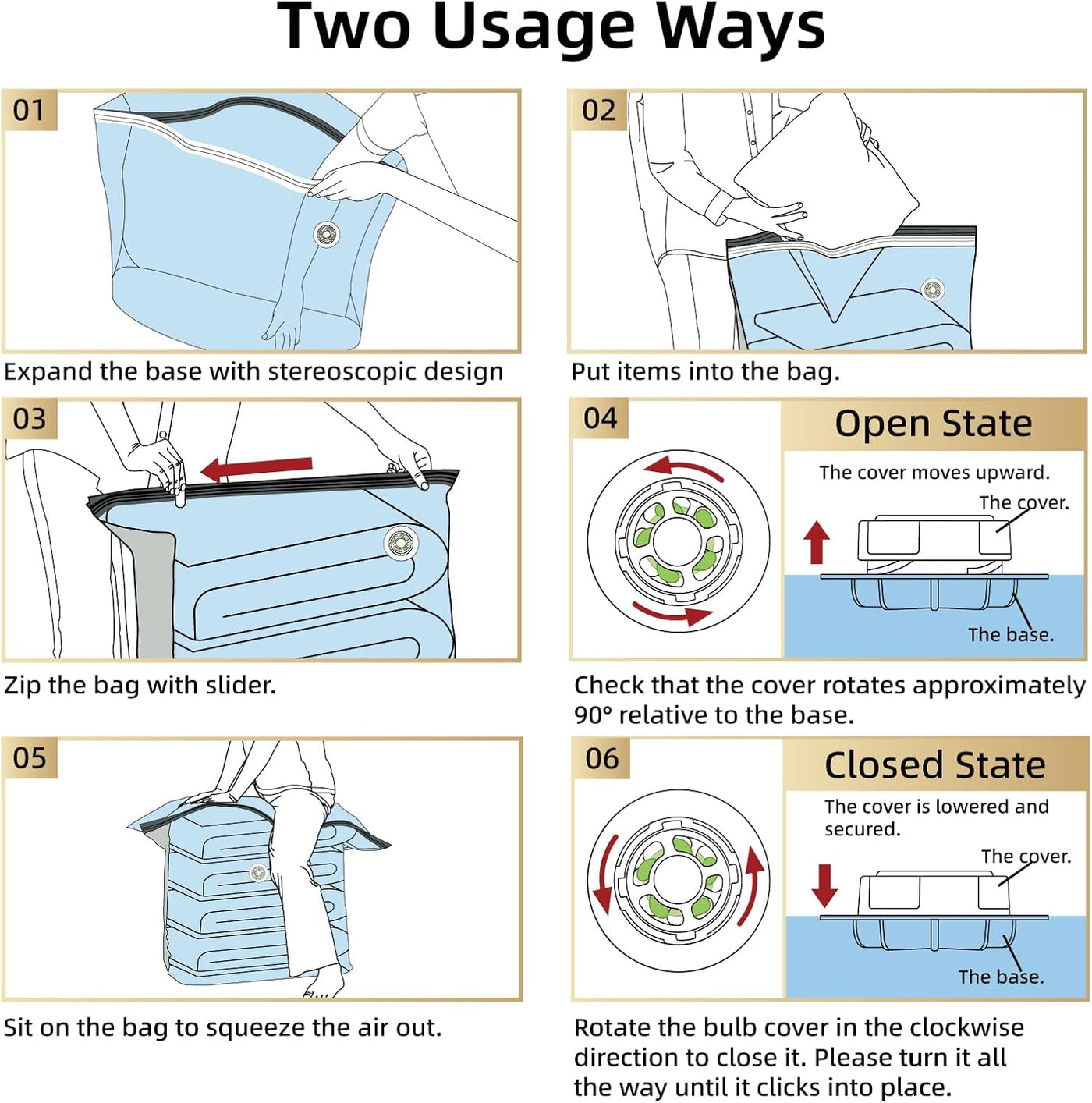 Dual-action operation: Our upgraded air valve lets you remove air quickly—by hand or with a vacuum. Simply place items in the bag, seal the zipper, open the valve, press out air, and close. Use the included white adapter with a vacuum for fast sealing, or simply press by hand or sit on the bag to remove air—with or without a vacuum, it’s easy to pack anytime, anywhere