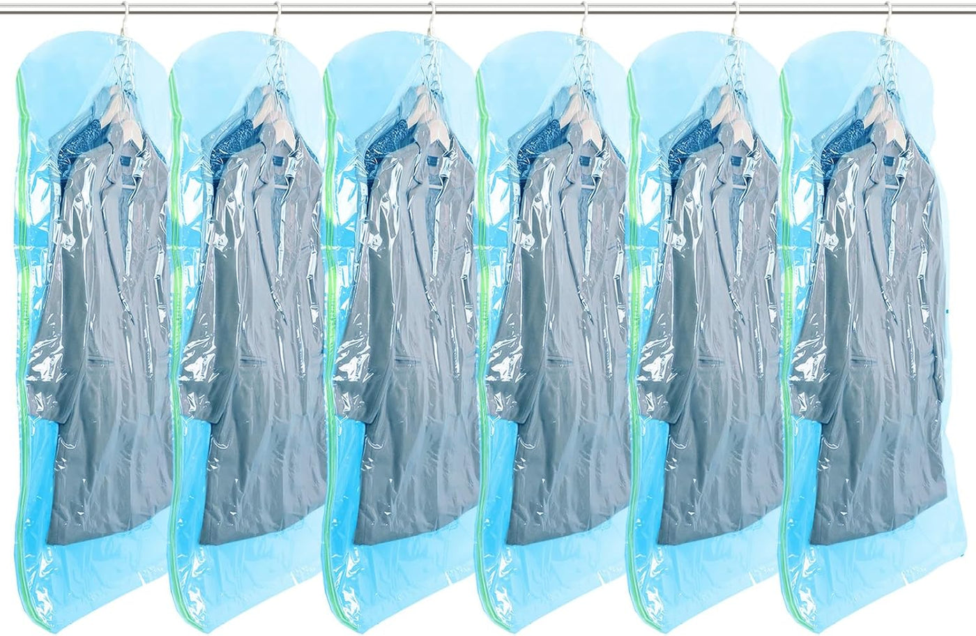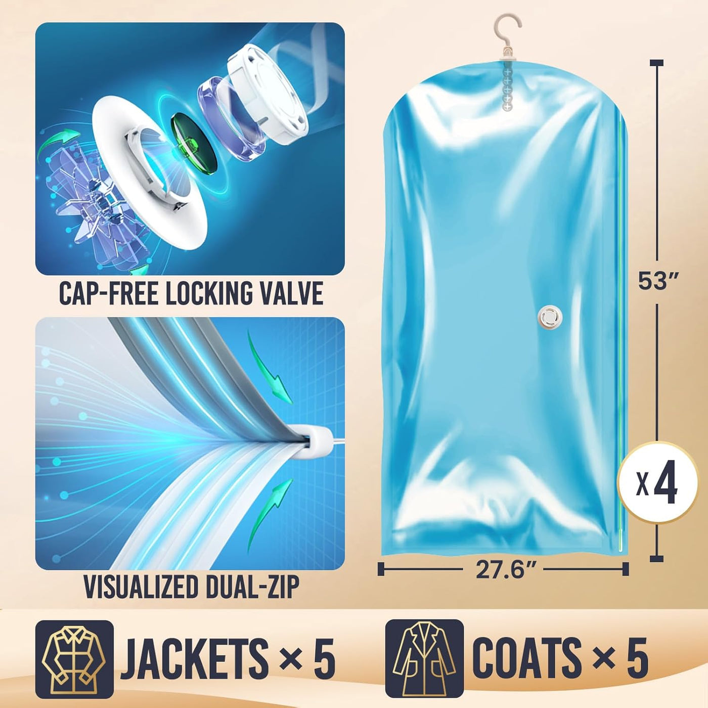 Closet Storage and Organization: With our hanging vacuum bags, you can hang up to 5 pieces of clothing, including jackets, suits, and coats, in one bag and remove air from vacuum bags to reduce original space