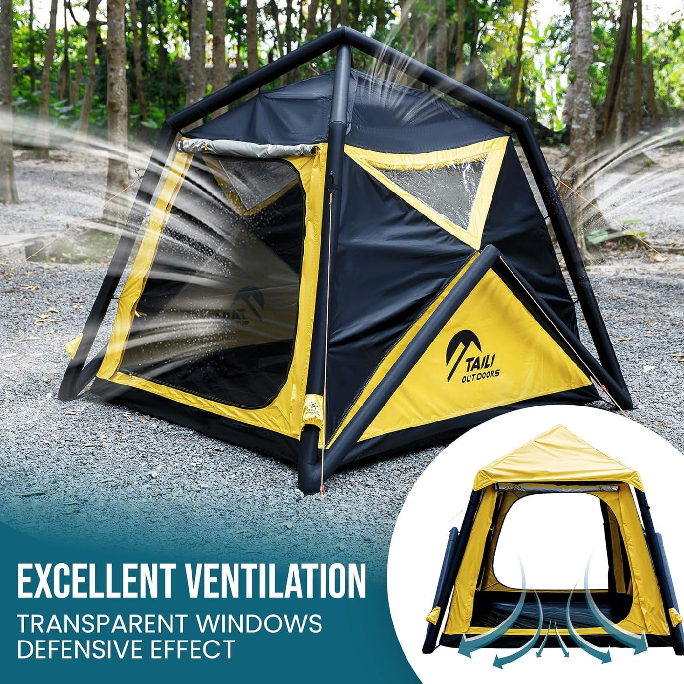 Excellent Ventilation & Anti-Mosquito: The inflatable tent features a fabric layer for wind and rain protection, and a mesh layer for ventilation and insect prevention. The camping tent's bottom has a threshold height and zippers on both sides. At night, you can fully zip up the doors to ensure a tight seal, effectively keeping insects out of the tent
