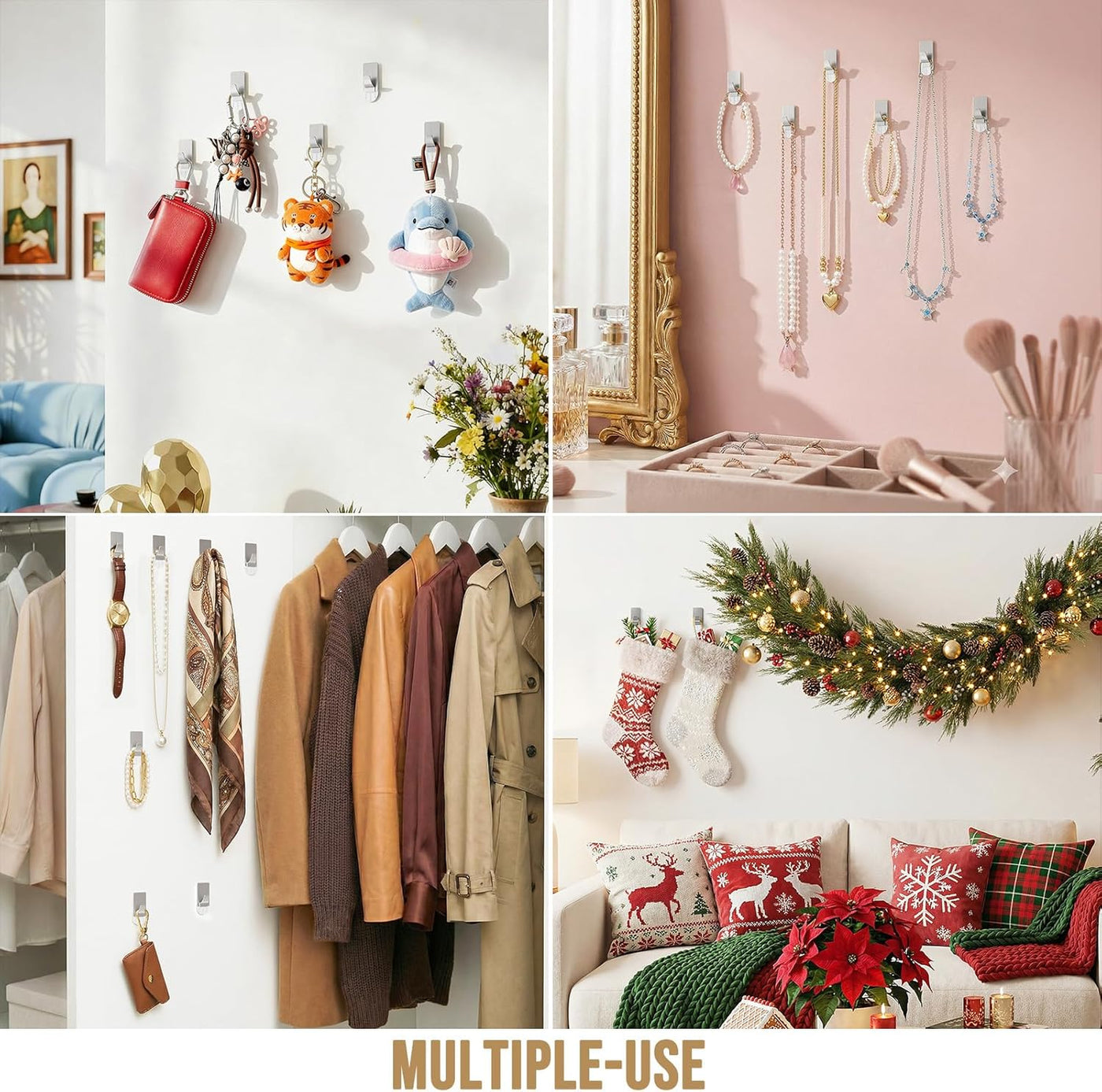 Stylish Design & Stainless Steel: Metal hooks design fully utilizing the space of living room, bedroom, kitchen, bathroom, dorm and entryway. Suitable for various purposes, including organizing kitchen utensils, closet organization, keys, mugs, towels, purses, hats, and wreaths. They are not merely practical tools, but also stylish accessories that add unique charm to your space