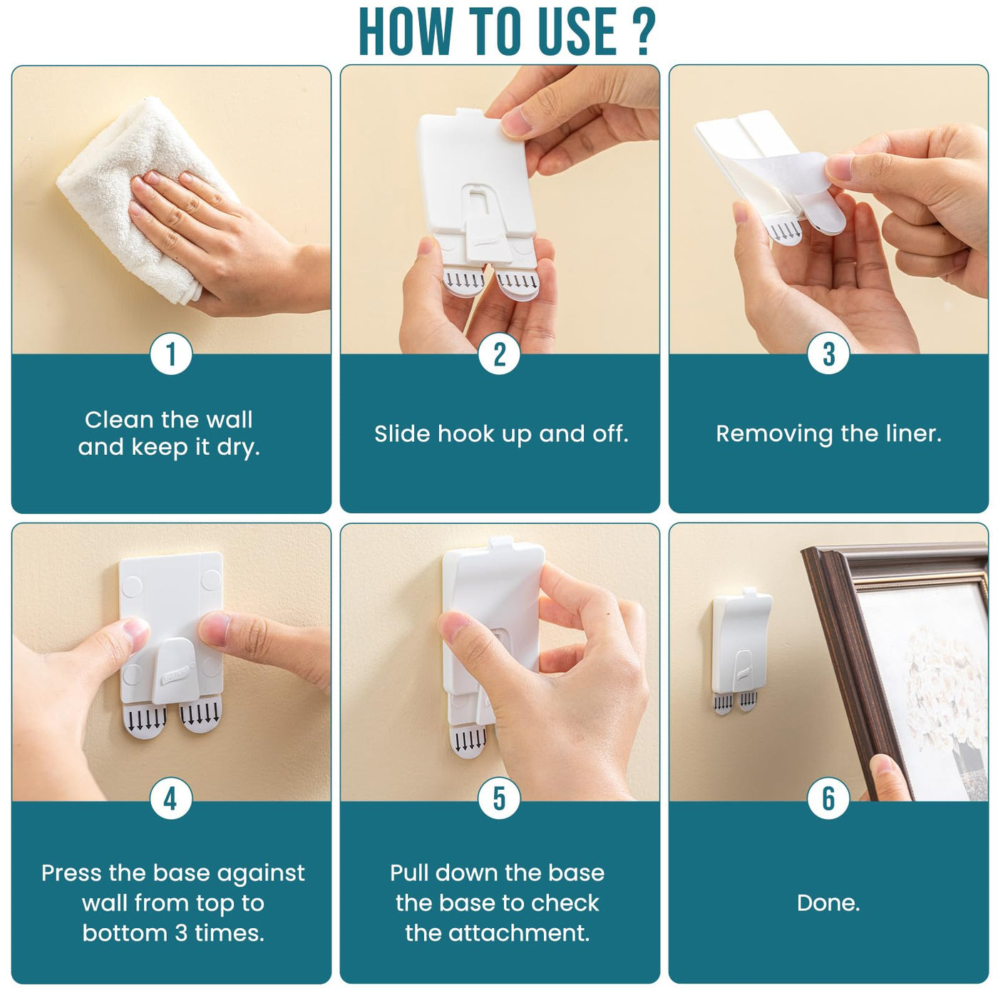 Damage Free & Reusable: The adhesive picture hangers can be removed and repositioned without leaving any marks or damage on your walls. Removal is effortless—just remove the hook, lightly hold the base, stretch the tape slowly until the base and strip released. You can reuse again by replacing the strip