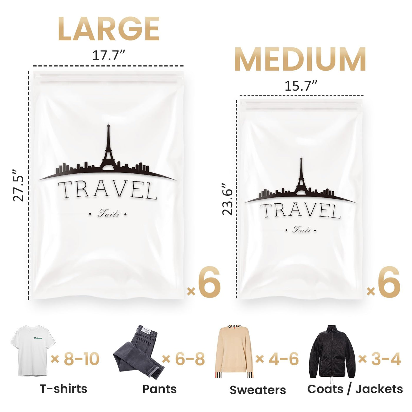 Classic Appearance: The travel combo includes Large size 27.5x17.7 Inch and Medium 23.6x15.7 Inch compression packing bags. The transparent design allows for easy content identification, while the elegant Tower pattern adds a touch of sophistication to your storage solutions
