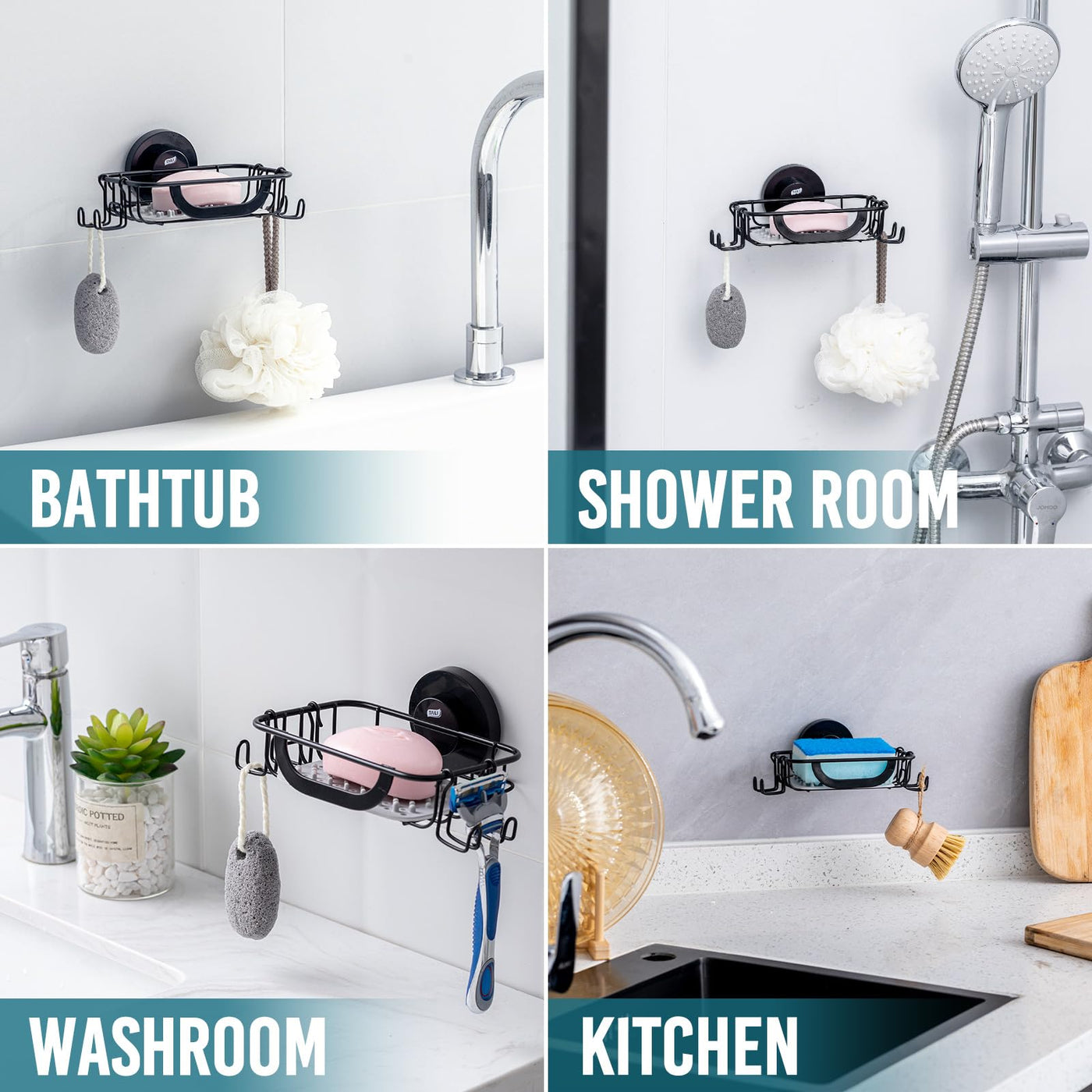 EASY TO CLEAN: Shower soap bar holder suction cup is removable, and easy to clean, ideal for bathroom, kitchen, laundry rooms, washbasin, sink or bathtub. This soap holder for shower wall is waterproof, the best choice for storing soap, sponges, and brushes