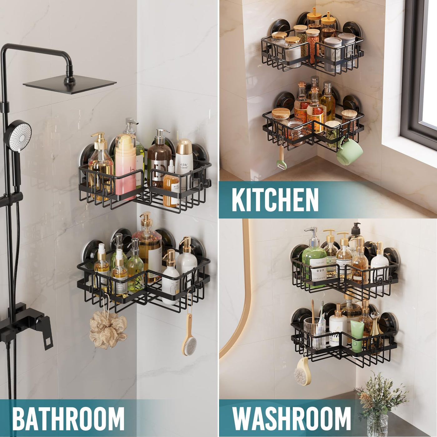 Multifunctional: The shower caddy with suction cups is perfect for bathroom and kitchen storage, such as hand sanitizer, disinfectant cleaner, shampoo, conditioner, body wash, cleanser, kitchen utensils, etc., anywhere you need to organize storage. Each corner basket shelf has 2 hooks to organize loofahs, shower brushes and other bath products