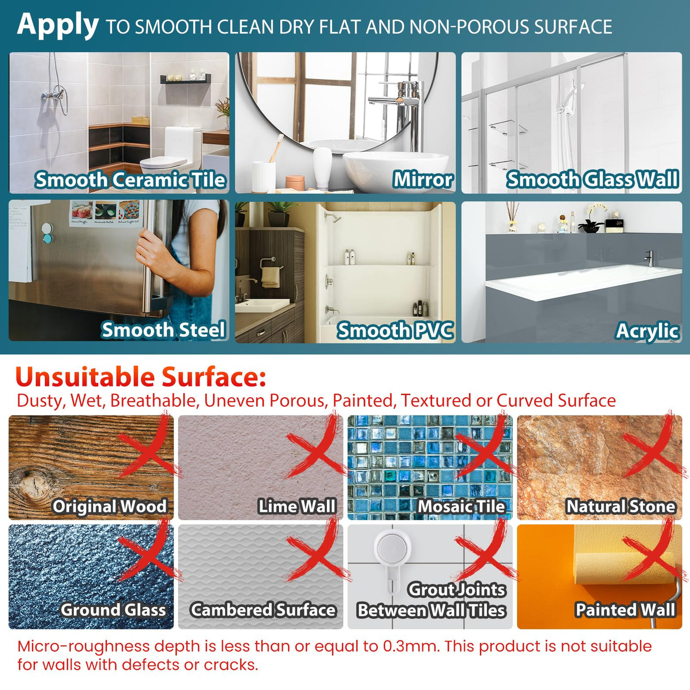 Warm tips: The suction cups only stick on smooth, non-porous surfaces like metal, glass, tile, stainless steel and acrylic but not apply to uneven tiles, texture plate, unfinished marble, wallpaper, painted wall, etc. If any of TAILI products did not meet your requirements, simply contact us and we'll help to solve it in 24 hours.