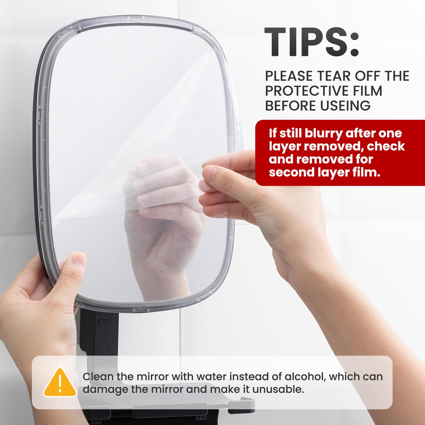 WARM TIPS: Remove a protection film on the no fog shower mirror surface before first use. If still blurry after one layer removed, check and removed for second layer film. Cleaning your mirror only with soft cloth and warm water. The suction cup of anti-fog shower mirror does not apply to uneven tiles, texture plate, unfinished marble, wallpaper, painted wall, etc
