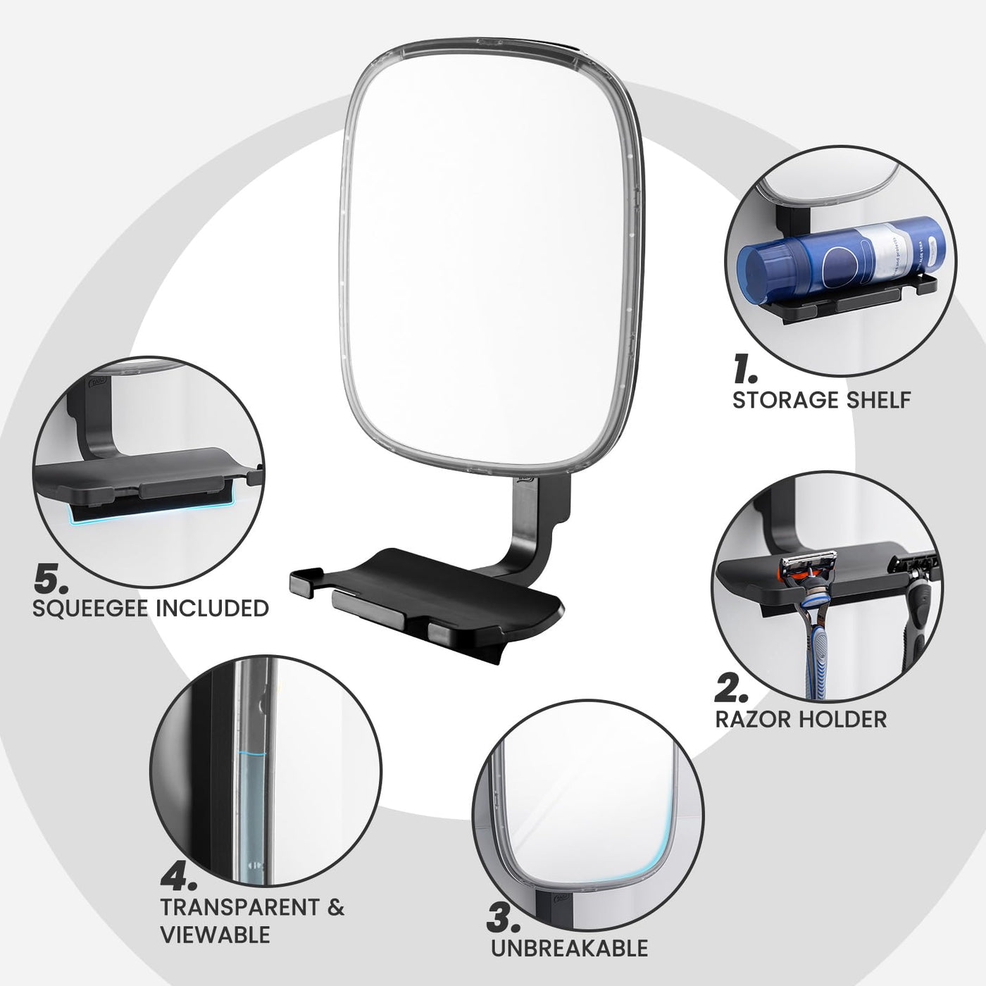 SHATTERPROOF & CLEVER DESIGN: The anti-fog mirror for shower is made of acrylic, hard to be broken, shatterproof, convenient for shaving, showering, removing makeup and brushing teeth. Anti-fog shower mirror with 2 razor holders, accommodate most razor sizes. Multifunctional rack can storage shave gel and other essentials, save more space and luxury, makes your shave, remove makeup, brush teeth effortless, more convenient to use