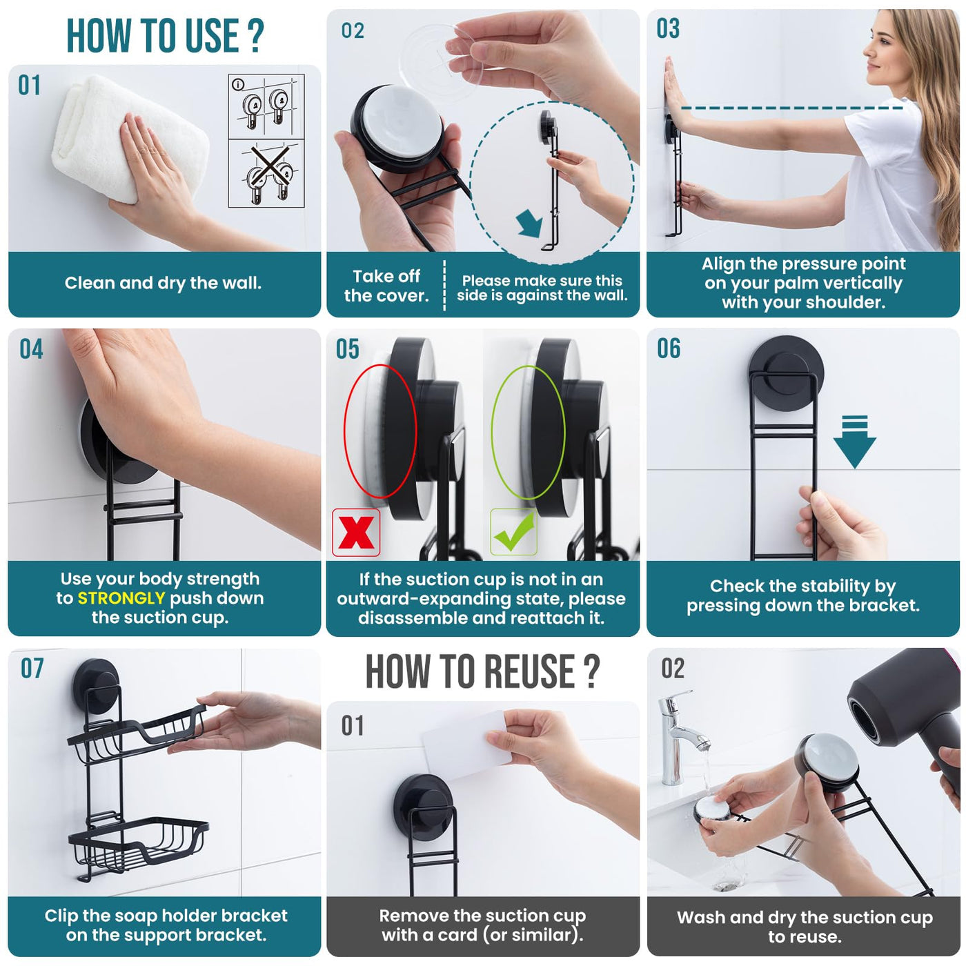 QUICK INSTALLATION: Simply press down the suction pad to squeeze the air out, they will stick to the wall firmly. You can finish the installation in 1 second. No screws, nails, glue or tools required for installation. (Please clean the wall and keep it dry, pay attention to avoid installing at the tiles with gaps to ensure vacuum suction)